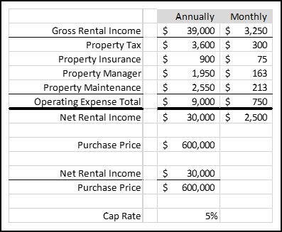 On a purchase price of $600K, that $30K net rental income gives us a cap rate of 5%.